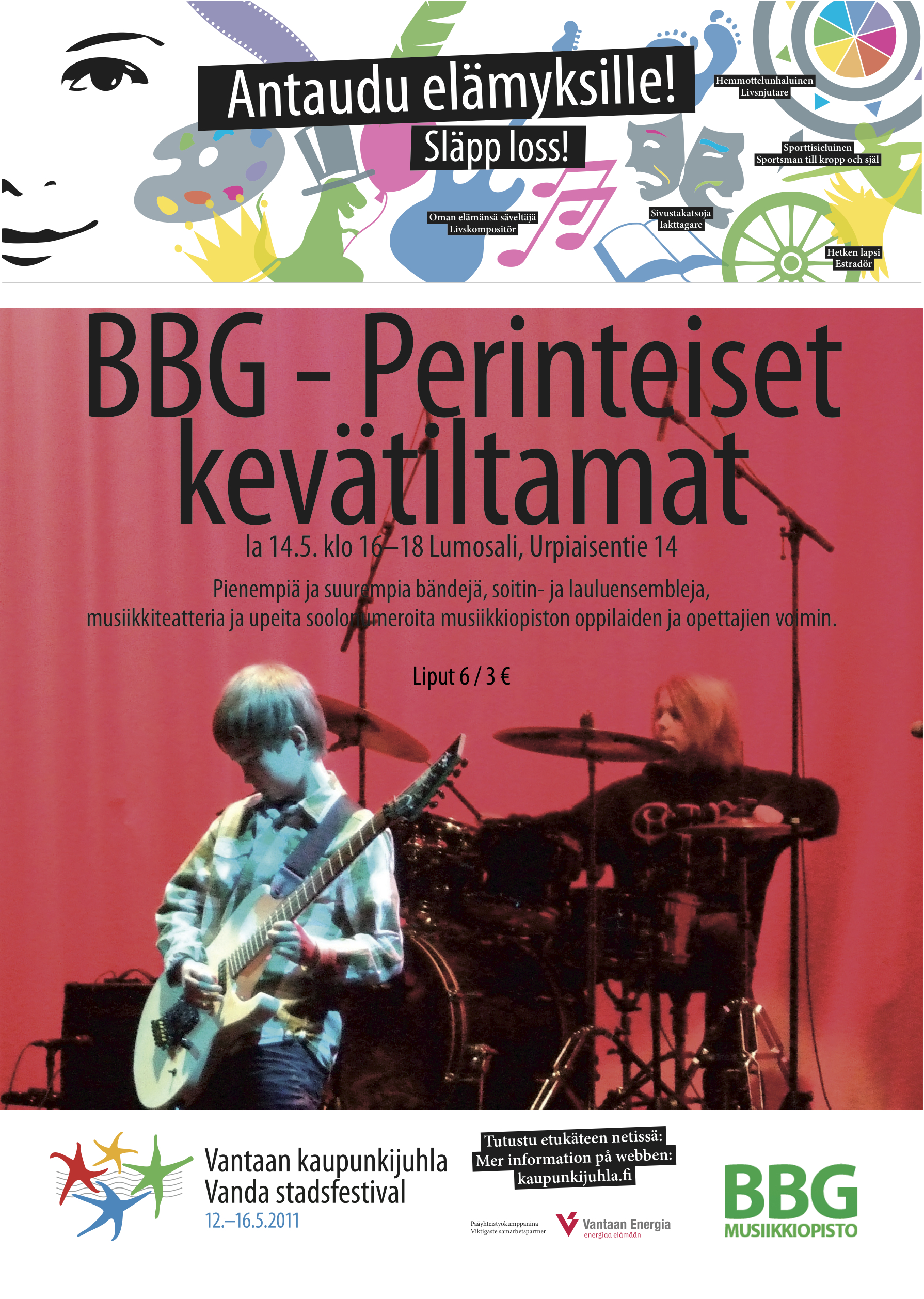 Musiikkiopisto BBG osallistuu Vantaa-päivän juhlintaan jo kolmatta kertaa järjestämällä keväiset iltamat. Lavalla nähdään niin oppilaita kuin opettajiakin, ja ohjelma on entiseen tapaan täynnä tunnelmaa ja yllätyksiä.